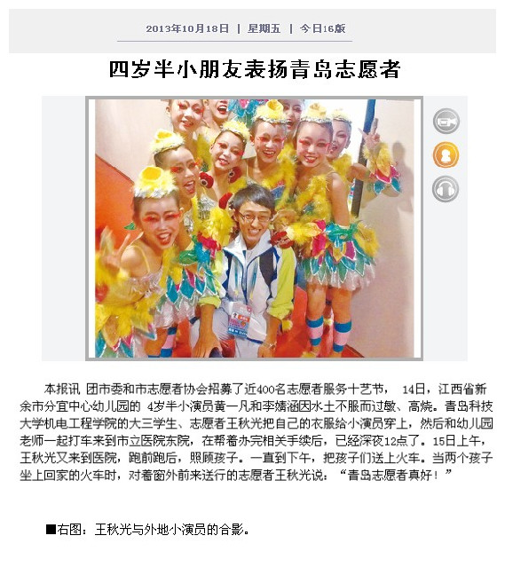 11月13日上午,太阳成tyc7111cc分团委收到一封来自青岛港中旅(山东)旅行社有限公司的感谢信,信中表达了对公司员工机自114班任建桥同学服务第十届中国艺术节的感谢。