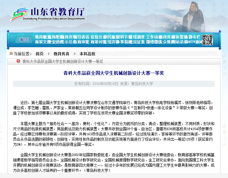 近日,第七届全国老员工机械创新设计大赛决赛在山东交通学院举行,公司太阳成tyc7111cc杨福芹、张泽荣老师指导,谭业成、李艺姗、雷凯、严家全、常新朝五位同学设计制作的参赛作品《“互联网+快…