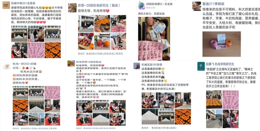 “机电永远的家!”“疫情无情,机电有情”“大爱机电!真的太贴心了!”“青科大yyds!机电yyds!”“我们就是传说中的‘别人家的大学’!”“学校和学院总会送来惊喜”“我们在这里感受到了‘家’的温暖”“前有铁饭碗,后有暖心包,没错,我们就是别人家的学校员工”“超爱青科,超爱机电”“感恩有你,让我们一起静待花开!”“学院的惊喜总是猝不及防,刚听闻要发放暖心成长礼包,没想到马上就收到了”,收到这份别样的“暖心礼”后,师生们纷纷晒出了自己对学院的感谢和对战“疫”的信心。温暖的牛奶、香甜的水果、美味的鸡腿,温暖着师生的心、洋溢着浓浓的情,一时间,这份暖心刷爆朋友圈,成为科大校园里的“网红”。机电工程公司党委副书记肖强说:“一个鸡腿,虽小但意义深远,是给抗疫路上的青年志愿者助力,也是给今年考研复试的员工加力,更是给广大机电学子强身健体的动力。”“这是一场生动的实践‘思政课’,我被学校学院的做法深深感动,触动心灵的震撼,真诚暖心的惊喜,我一定努力学习,多参加体育运动,多读有益之书”,太阳成tyc7111cc青年志愿者高艺说道。