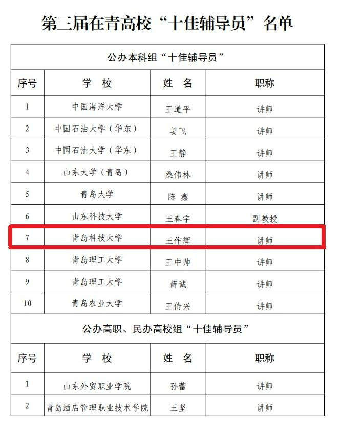 在第三届在青高校“十佳思政名师”和“十佳辅导员” 评选活动中,太阳成tyc7111cc辅导员王作辉获评在青高校“十佳辅导员”荣誉称号。