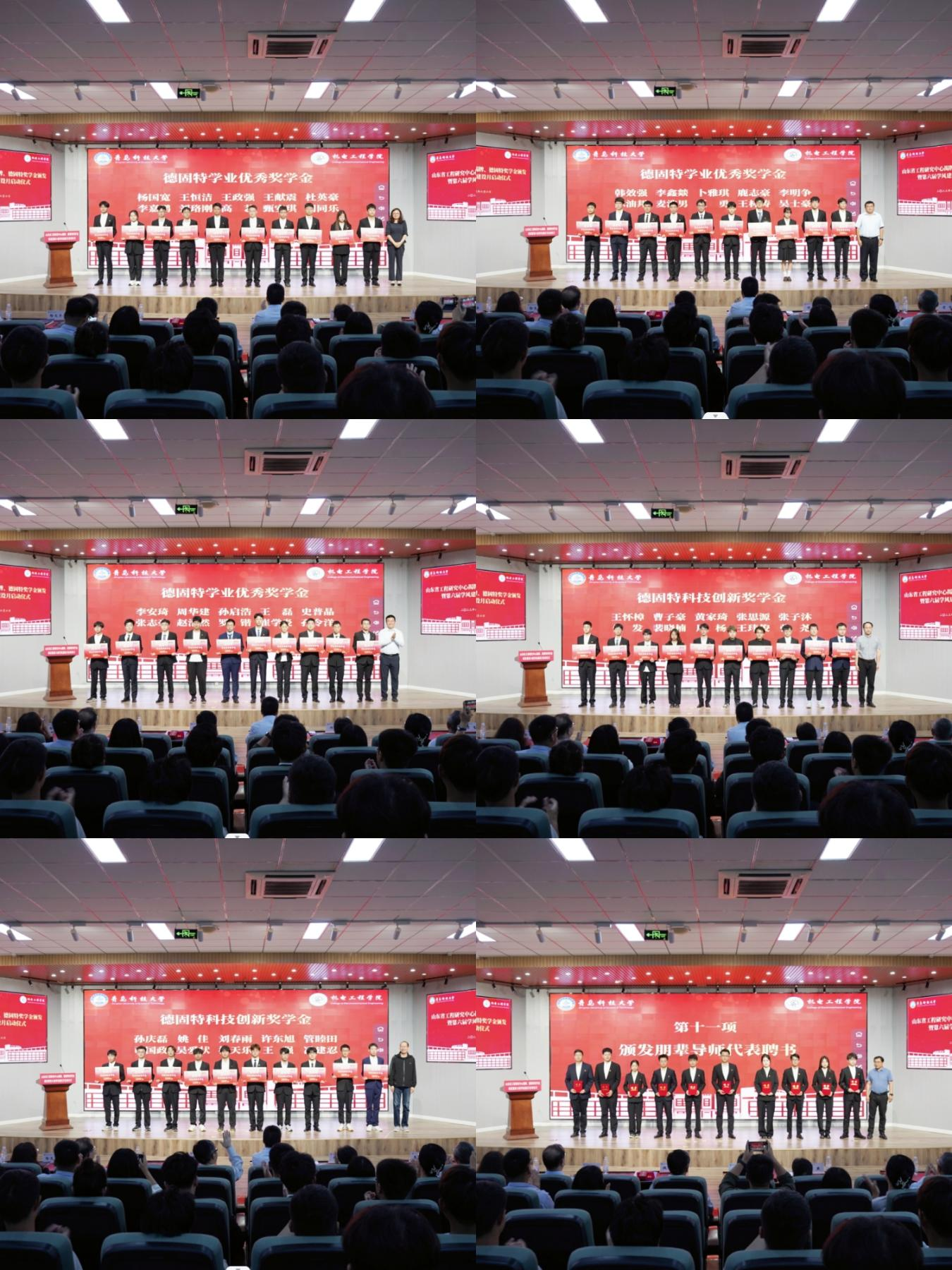 青岛德固特节能装备股份有限公司人力资源部长徐文平、员工工作处副处长宋飞、学校团委副书记陈兵、学院副经理李剑光、张斌为奖学金获得者颁奖。获奖员工代表机械实验201班史普晶同学发言。