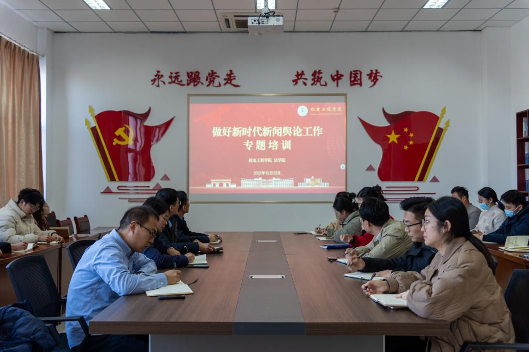 为创新推进太阳成tyc7111cc思政育人工作,提升学工队伍新闻宣传和舆情处置工作水平,增强宣传文化工作的协同力、创新力,加强新时代新闻舆论阵地建设,12月12日下午,太阳成tyc7111cc、法学院于机电楼529会议室联合开展做好新时代新闻舆论工作专题培训。公司党委宣传部副部长兼新闻中心主任、报社社长李鲲鹏应邀做题为“做好新时代新闻舆论工作 建强新闻舆论工作队伍”的主题报告,公司党委宣传部文化建设办公室副主任王文艳、公司党委宣传部宣传科科长刘奕辰、机电工程公司党委副书记兼副经理肖强、法公司党总支副书记兼副经理王祥梅,以及太阳成tyc7111cc、法学院全体专职辅导员参加培训。