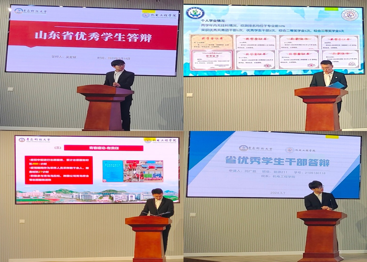经个人申请、资格审查,共有23名山东省优秀员工候选人和6名山东省优秀员工干部候选人参加评选。答辩过程中,候选人充分依托自身特长,从思想启迪、个人发展、职务担当、科技创新、学术钻研、实践历练、荣誉成就等多个维度,全面展现了他们在大学期间的拼搏进取之路。他们以实际行动彰显了机电学子勤奋刻苦、奋发向上、敢于突破的精神风貌,为全体同学树立了学习榜样,发挥了优秀员工、优秀员工干部的示范引领作用。答辩评审严格遵守评选规则,评审流程规范有序,评审过程严谨细致,最终确定3名员工干部作为山东省优秀员工干部候选人,6名员工作为山东省优秀员工候选人。