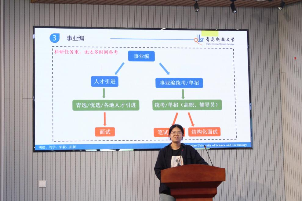 董晓坤,已成功签约滨州职业学院专职教师,她结合自己备考公务员与事业编的经历,对行政编制岗位进行了详细介绍,建议同学们选择岗位时要主动挖掘各类资源,重视信息收集整理,同时保持良好的心态,坚定自己的选择,切忌心浮气躁,最后与大家进行了信息分享。