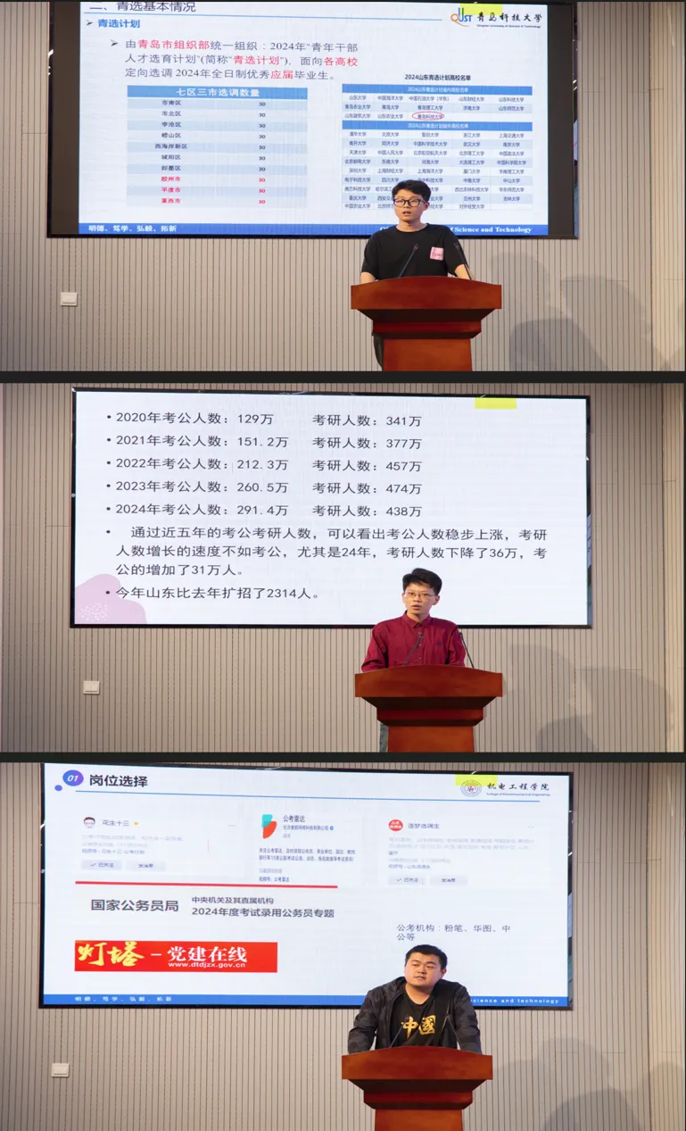 基层就业员工代表彭泰源、夏正、任仲哲分别结合自己的备考经历,从前期准备、备考策略、面试技巧、心态调整等多个方面进行了详细的阐述,并鼓励同学们制定合理的学习计划,夯实基础知识,提高自身综合素质,为后续环节做好充分准备。