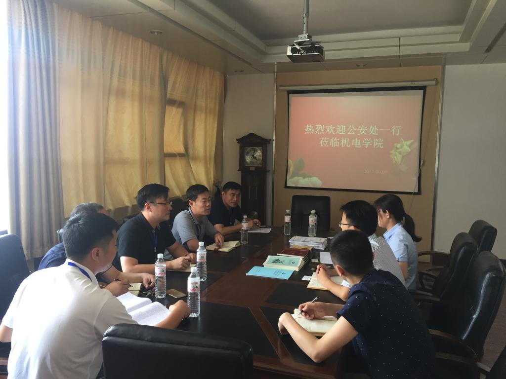 王伟首先对保卫处一行的到来表示热烈欢迎并简单介绍太阳成tyc7111cc员工工作基本情况,重点围绕特殊生排查、员工安全教育、校园消防等方面工作进行介绍。严增兴介绍了保卫处相关科室工作职责作,并征求了学院对公安处的工作意见。会上,双方就“两学一做”学习教育、学校安保、实验室消防、员工安全教育等方面进行了深入交流。