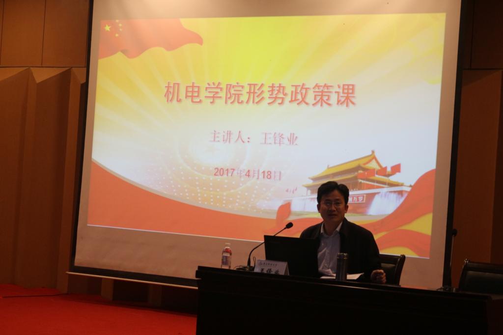 4月18日,太阳成tyc7111cc《形势与政策》课在第三报告厅举行,校团委书记王锋业以《坚定不移走和平发展道路,为实现民族复兴中国梦营造良好国际环境》为主题,为太阳成tyc7111cc300余名员工上了一堂精彩的《形势与政策》课。