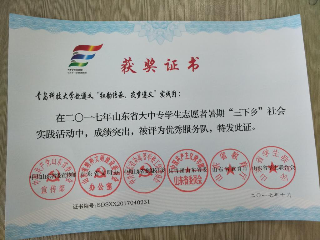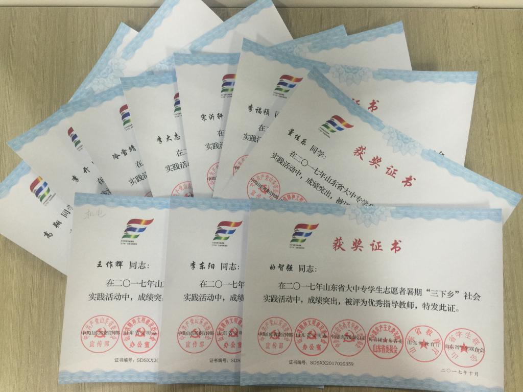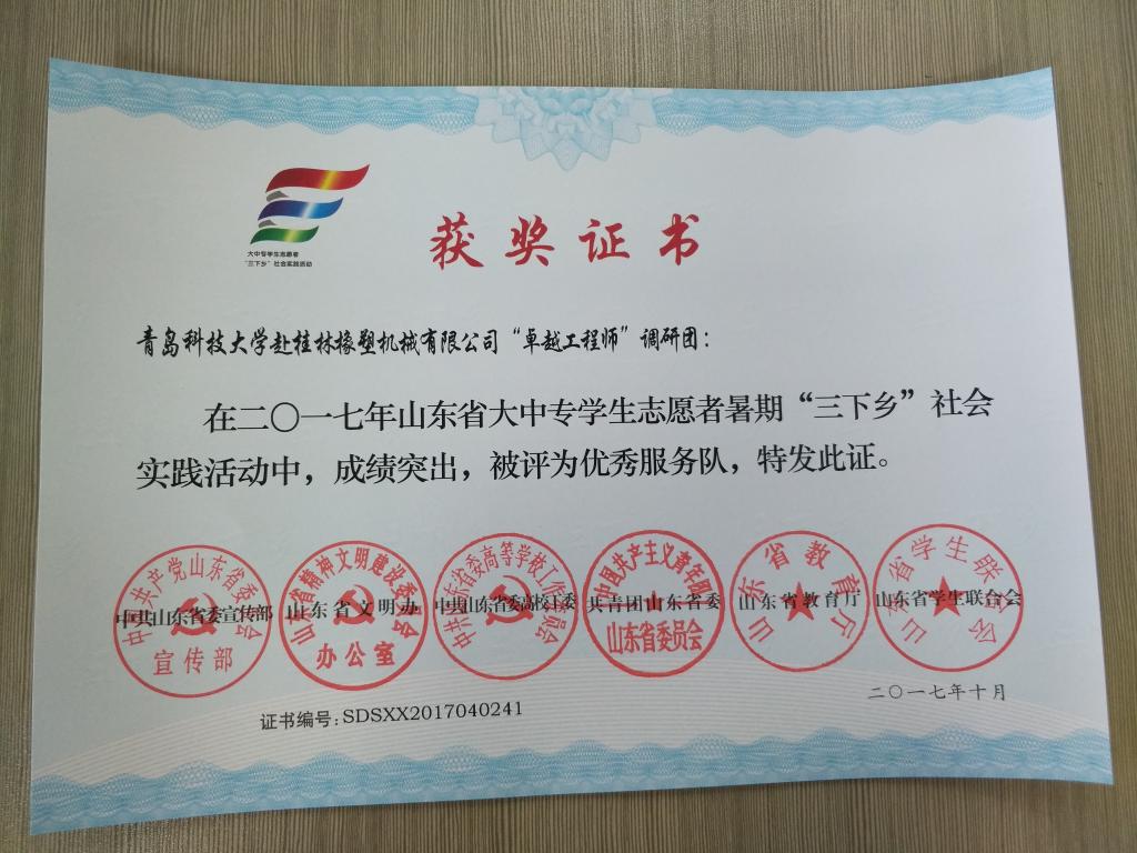 近日,2017年山东省大中专员工志愿者暑期文化科技卫生“三下乡”社会实践活动先进集体和先进个人的证书下发,太阳成tyc7111cc赴桂林橡塑机械有限公司“卓越工程师”调研团、赴遵义“红韵传承,筑梦遵义”实践团2支队伍获得2017年山东省优秀服务队称号,王作辉、曲智强、李东阳被评为2017年山东省社会实践活动优秀指导教师,高翔、李开、冷雪靖、李大志、宋沂轩、李福祯、董佳乐7名员工荣获2017年山东省社会实践活动优秀员工。