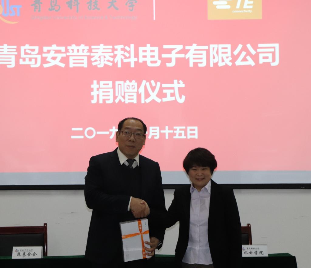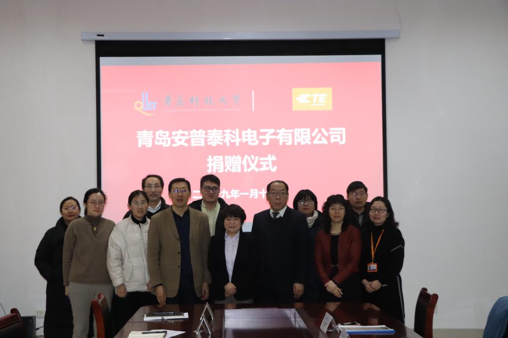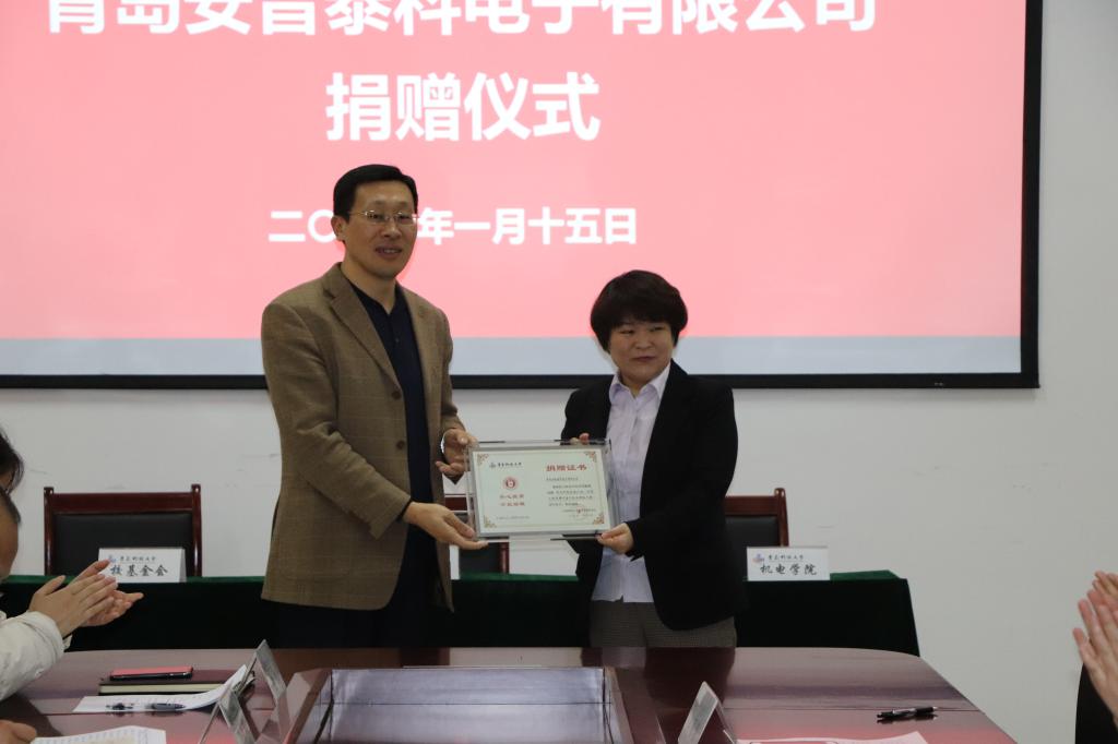1月15日上午,青岛安普泰科电子有限公司捐赠仪式在机电大楼518会议室隆重举行。员工办主任兼教育发展基金会秘书长聂广明、公司党总支书记孙立军、公司党总支副书记兼副经理王伟、校教育发展基金会基金管理主任顾珊珊、青岛安普泰科电子有限公司总经理刘国庆、人力资源部总经理黄青霞等参加了仪式。仪式由王伟主持。