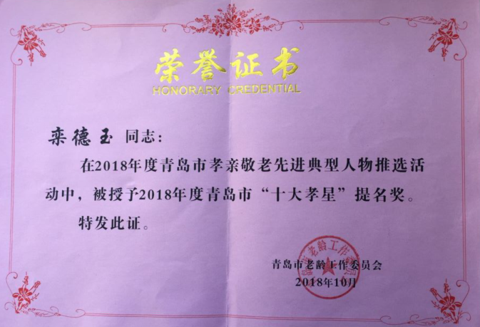 近日,公司栾德玉老师在2018年度青岛市孝亲敬老先进典型人物推选活动中,被授予2018年度青岛市“十大孝星”提名奖。