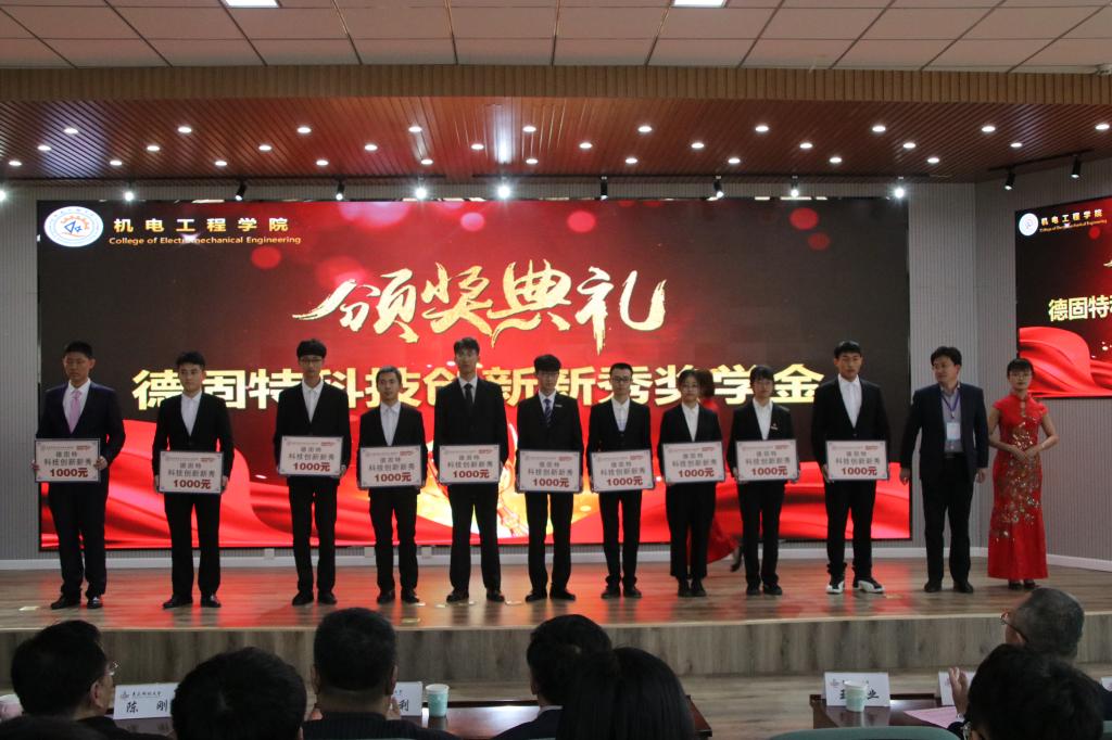 在昂扬的校歌中,陈刚处长、王锋业书记、何燕经理、魏振文董事长、崔建波副总经理分别给获得德固特学业优秀奖学金、德固特科创新秀奖学金同学颁奖。毕岚森同学作为员工代表进行了发言。
