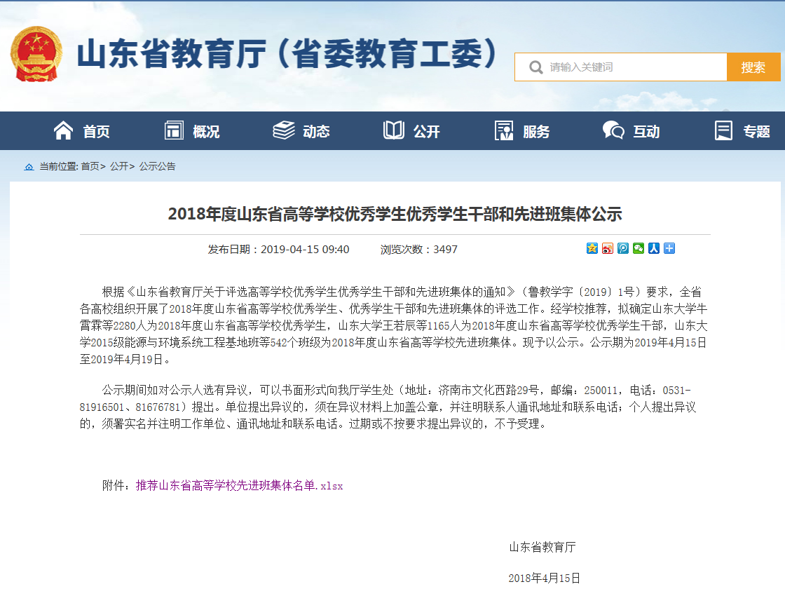 根据《山东省教育厅关于评选高等学校优秀员工优秀员工干部和先进班集体的通知》(鲁教学字〔2019〕1号)要求,全省各高校组织开展了2018年度山东省高等学校优秀员工、优秀员工干部和先进班集体的评选工作。经学校推荐,拟确定山东大学牛霄霖等2280人为2018年度山东省高等学校优秀员工,山东大学王若辰等1165人为2018年度山东省高等学校优秀员工干部,山东大学2015级能源与环境系统工程基地班等542个班级为2018年度山东省高等学校先进班集体。