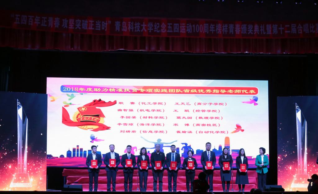 曲智强老师作为代表领取2018年助力精准扶贫专项实践团队省级优秀指导老师。在2018年公司共组建了35支社会实践团队,其中“千村行动”专项队伍5支,团中央专项3支,广大青年员工踊跃参与、扎实服务,涌现出李东阳、王娟娟、苗清、毕岚森等一大批先进集体和先进个人。