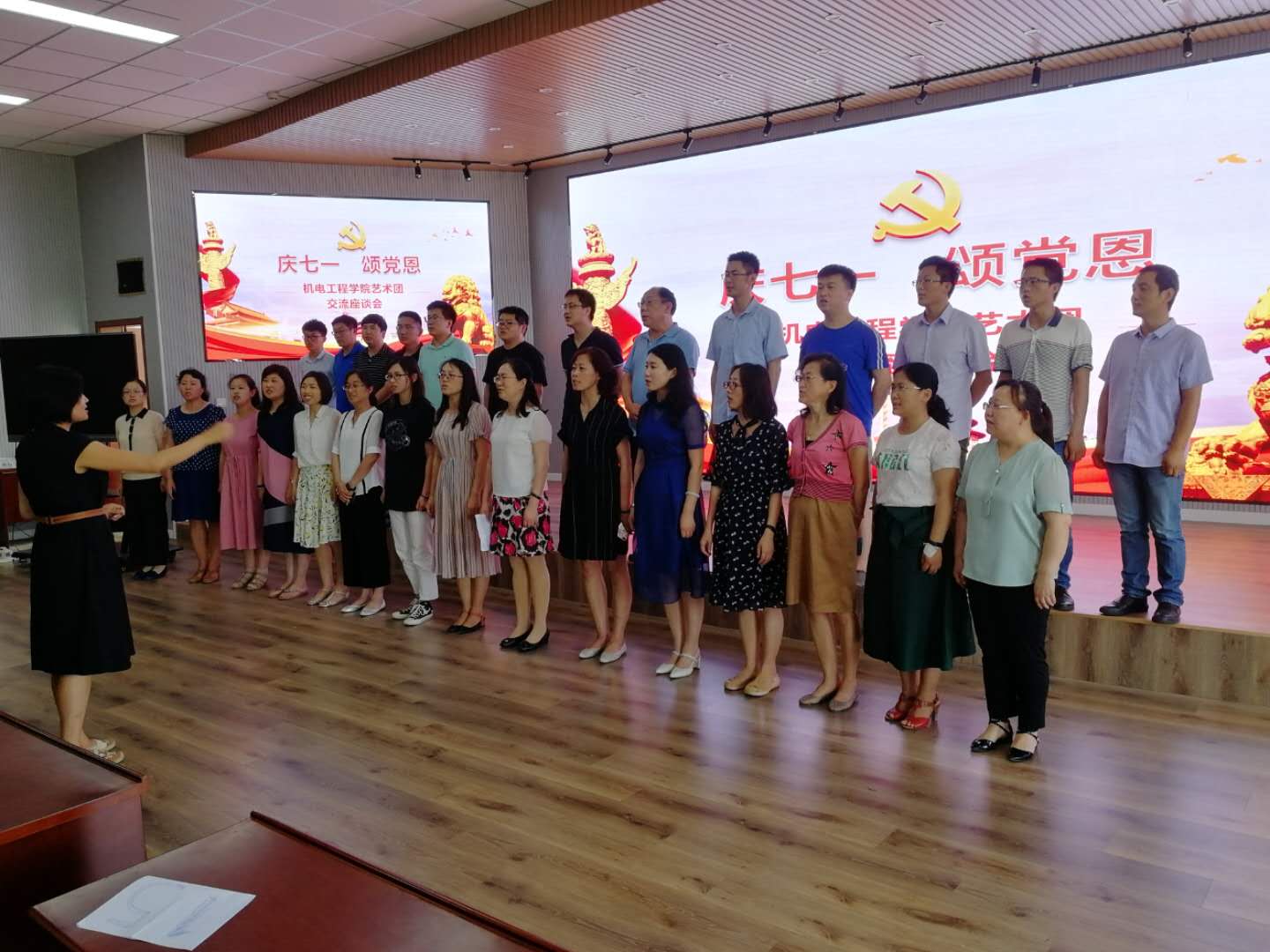 座谈会在热情激昂的合唱中拉开帷幕。朱惠华老师献唱《莫斯科没有眼泪》、李利老师一首《春闺梦》选段掌声阵阵,胡海明老师《歌唱祖国》饱含深情,付平老师感谢大家对学院分工会工作的支持并献唱《潇洒走一回》,王帅老师深情现场《我的祖国》,公司党总支书记孙立军清唱《呼伦贝尔》并寄语在座各位老师一是要不忘党恩,不忘初心,一心跟党走;二是要有信心、培养兴趣爱好,陶冶情操,形成良好氛围。最后座谈会在集体高唱《歌唱祖国》与《没有共产党就没有新中国》中结束。