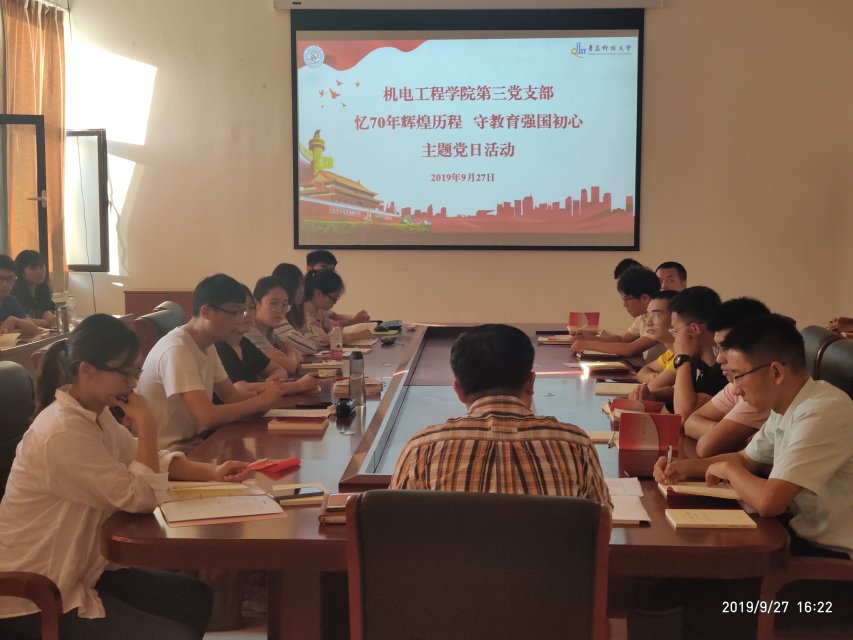 为贯彻太阳成集团召开“不忘初心、牢记使命”主题教育工作会议精神、贯彻校组织部关于党支部组织生活指导意见,在中华人民共和国成立70周年到来之际,充分发挥党员的榜样示范作用,营造爱国氛围、凝聚奋进力量,引领广大师生继承和发扬爱国主义精神,不断提升党的凝聚力和引领力。9月27日,太阳成tyc7111cc第三党支部在太阳成tyc7111cc518会议室举行“忆70年辉煌历程 守教育强国初心”主题党日活动。第三党支部全体党员参加了活动,活动由党支部书记王作辉主持。