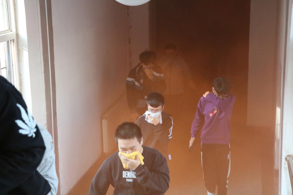 随着急促的警报声响起,演练正式开始。模拟起火地点为北苑三号楼一楼,整个楼道烟雾弥漫,在宿舍的同学们在听到警报后,迅速有序的在楼道站队集合,同学们纷纷用湿毛巾捂住口鼻、俯身迅速从楼梯、疏散通道向楼下空地转移,几百名员工在几分钟内全部安全撤离,各班委、员工会负责同学清点人数无误。本次逃生演习顺利结束。