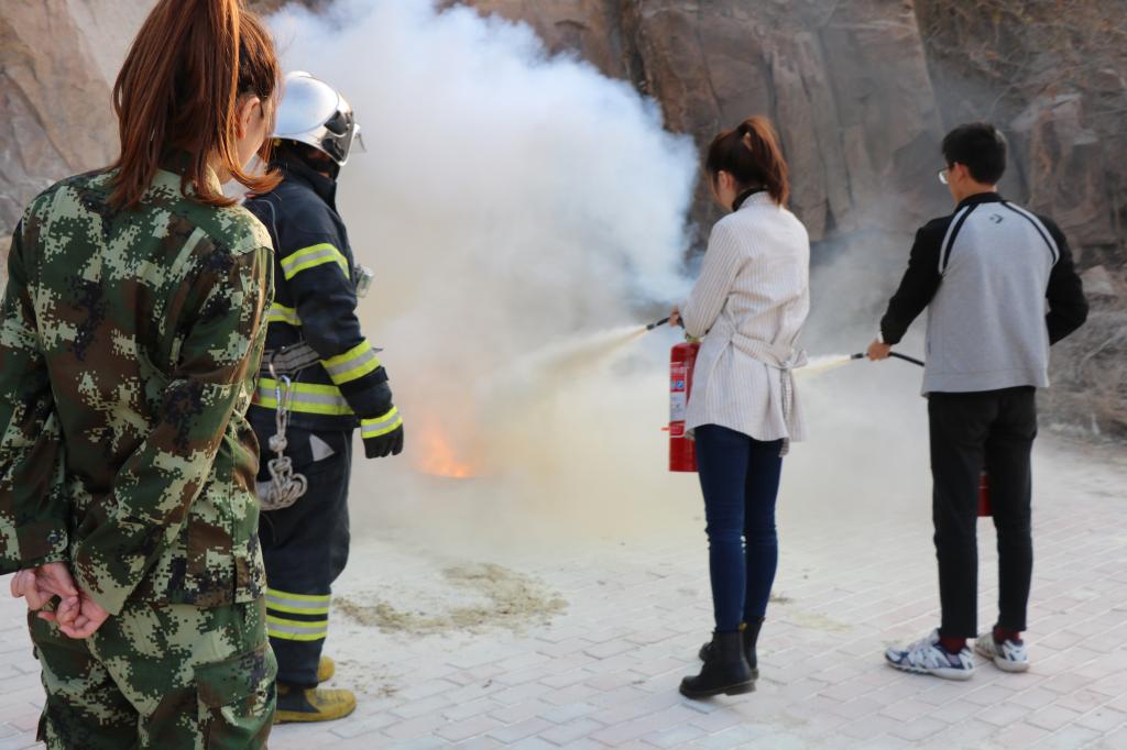随后,崂山区消防大队的消防员用云梯消防车为同学们模拟演示了用高压水枪灭火和用伸缩云梯救助被困人员的场景。最后,青岛市崂山区消防大队的张队长通过现场展示向大家生动而详细地介绍了干粉灭火器的使用方法,同时为了让现场的同学掌握灭火器的使用方法,消防大队准备了数十个干粉灭火器供大家练习操作。现场共二十名多同学体验了手持灭火器灭火,学会了正确使用灭火器的方法。