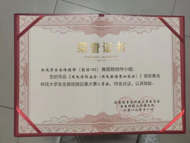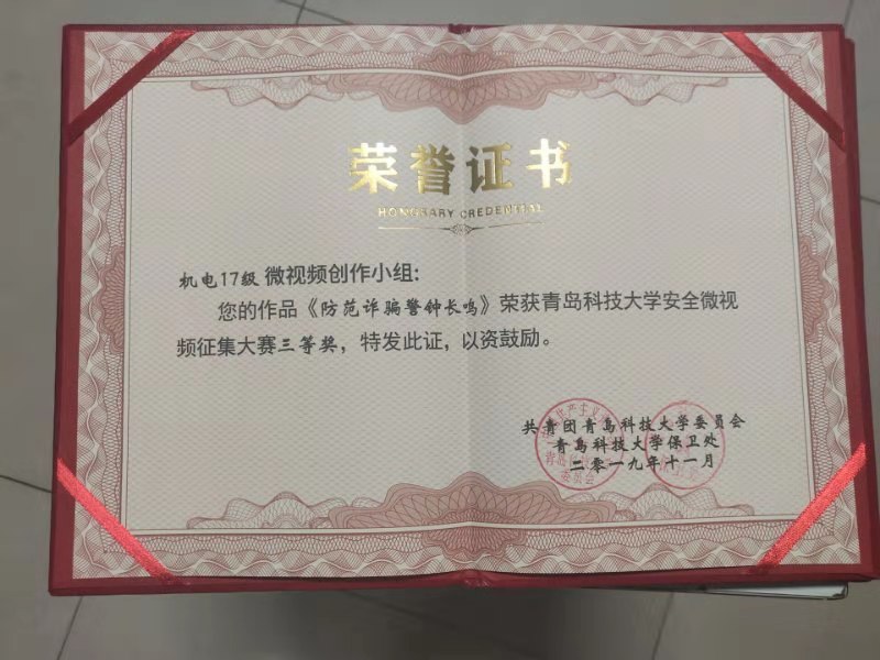11月19日,太阳成集团安全主题微视频征集活动颁奖仪式在尚舜报告厅举行,太阳成tyc7111cc在此次征集活动中获得佳绩。其中,17级员工制作的《防范诈骗警钟长鸣》、机电员工会传媒部(能源182)制作的《用电消防安全(用电器情景加采访)》荣获三等奖,太阳成tyc7111cc荣获优秀组织单位荣誉称号。