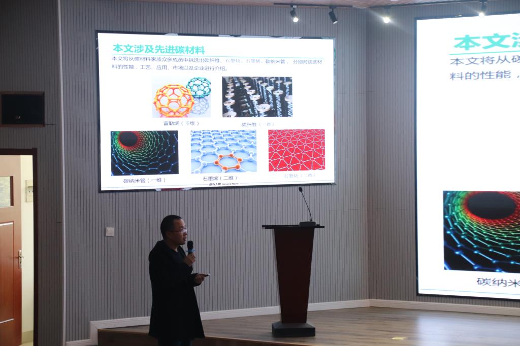 李岩作了题为《新型碳纳米材料的商业应用》的学术报告,报告中他讲述了碳纤维、富勒烯、石墨炔、石墨烯、碳纳米管五种新型碳材料的发展现状。并从投资和运营的角度,思考如何将技术开发与市场开拓、企业运营高效结合。指出碳纳米管等低维碳纳米材料具有高导电、高导热和优异的力学性能等特点,应用前景十分广阔,可广泛应用于新能源、生物医药、半导体及各类增强材料(如塑料、橡胶、涂料、水泥、电缆、导电剂、合金、轮胎等)。