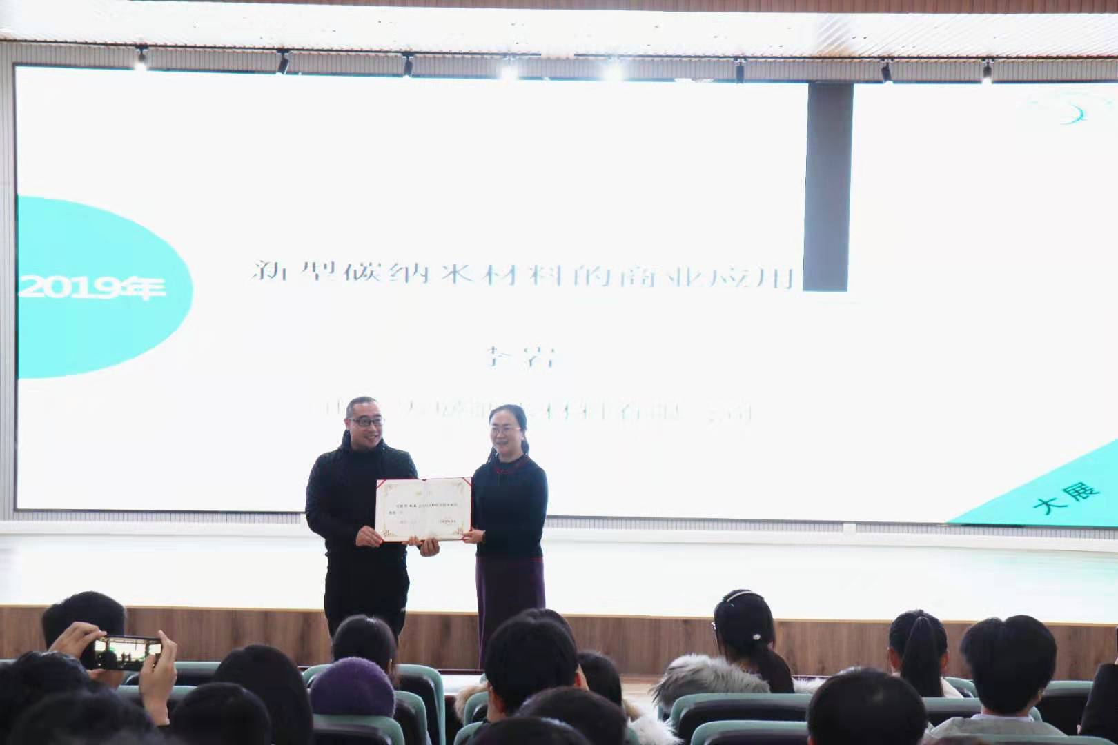 11月28日,太阳成tyc7111cc、山东省高性能碳材料制备及应用工程实验室邀请大展纳米材料有限公司李岩教授来公司做学术报告。太阳成tyc7111cc经理何燕参加了报告。