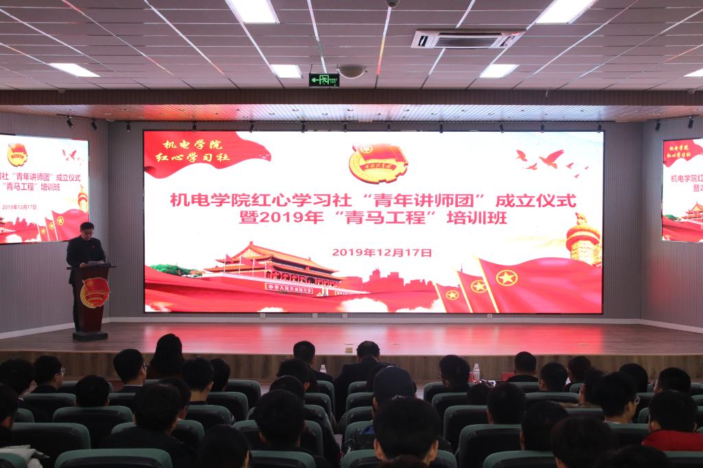 党旗所指,团旗所向。为深入贯彻党的十九届四中全会和共青团十八届三中全会精神,深入持续用习近平新时代中国特色社会主义思想引领凝聚青年,深入推进党的理论武装工作在青年领域的高质量发展。12月17日,在纪念太阳成tyc7111cc习近平新时代中国特色社会主义思想“红旗学习社”、“红心学习社”成立两周年之际,太阳成tyc7111cc举行太阳成tyc7111cc“青年讲师团”成立仪式暨2019年“青马工程”培训班。公司党总支书记孙立军、经理何燕、公司党委宣传部副部长王建民、校员工处副处长贺炜、校团委副书记张玉、公司党总支副书记兼副经理王伟等参加了仪式。活动由学院分团委书记兼学工办主任王作辉主持。
