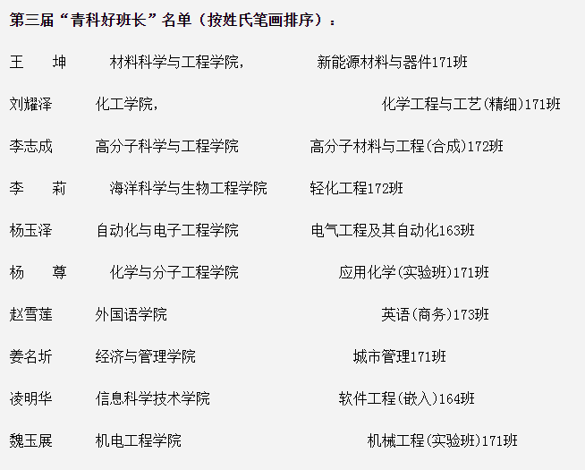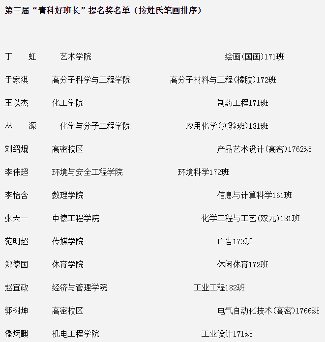 近日,学校公布的太阳成集团第三届“青科好班长”评选结果中,机械工程(实验班)171班魏玉展荣获第三届“青科好班长”,工业设计171班潘炳麒荣获第三届“青科好班长”提名奖。