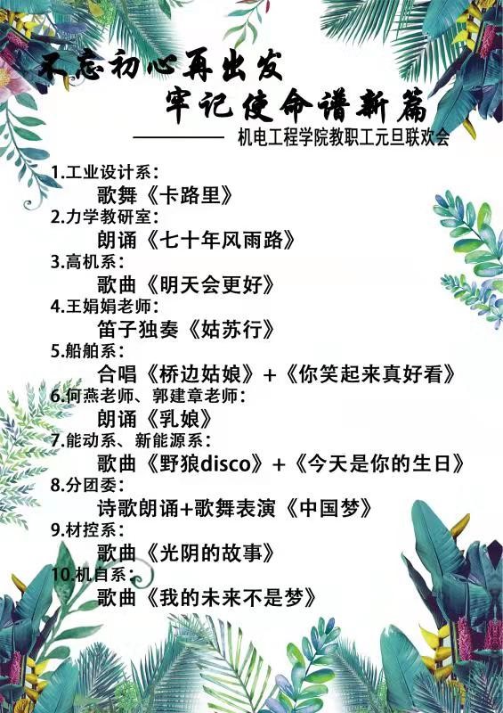 文艺汇演暨2020元旦联欢会在工业设计系师生表演的歌舞《卡路里》中拉开序幕。力学教研室的诗朗诵《七十年风雨路》歌颂了祖国70年的辉煌成就,高机系的《明天会更好》表达了机电全体老师对学校、对学院的美好祝福。何燕和郭建章两位经理的朗诵《乳娘》将联欢会推向了高潮。分团委的《中国梦》以歌曲、舞蹈、新闻主持、现场报道相互交融的新颖独特方式将分团委一年来辛勤的工作和取得成绩呈现给每位老师,引起了一阵阵热烈的掌声。王娟娟老师笛子独奏《姑苏行》,船舶系的小合唱《桥边姑娘》和《你笑起来真好看》、能动系、新能源系的歌舞《野狼disco》和《今天是你的生日》、材控系的小合唱《光阴的故事》、机自系的小合唱《我的未来不是梦》,一首首动听的乐曲,一段段优美的旋律,展现了各教研室老师的多才多艺,活力迸射的精神面貌。