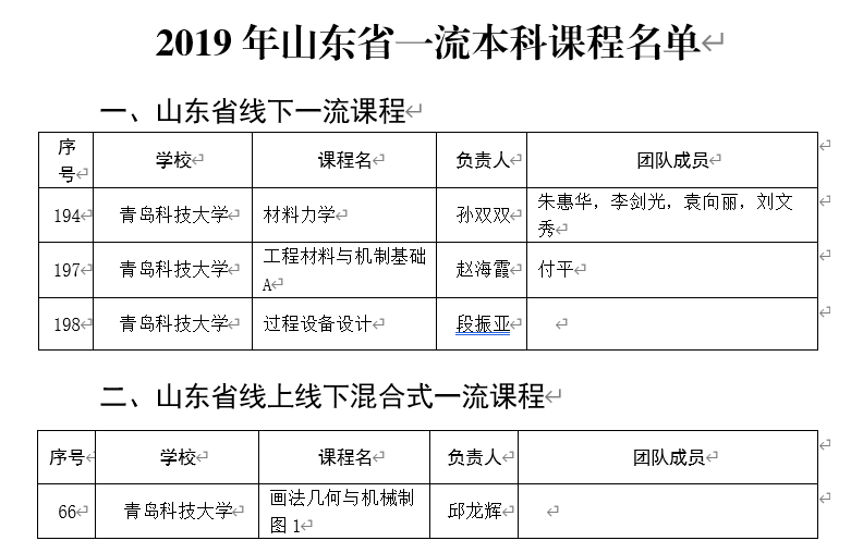 3月4日,在山东省教育厅公布的《关于公布2019年山东省一流本科课程认定结果的通知》中,太阳成tyc7111cc多门课程入选2019年山东省一流本科,数量居于全校前列。其中,山东省线下一流课程三门:分别是孙双双、朱惠华、李剑光、袁向丽、刘文秀团队《材料力学》,赵海霞、付平《工程材料与机制基础A》,段振亚《过程设备设计》。线上线下混合式一流课程一门:邱龙辉《画法几何与机械制图1》。