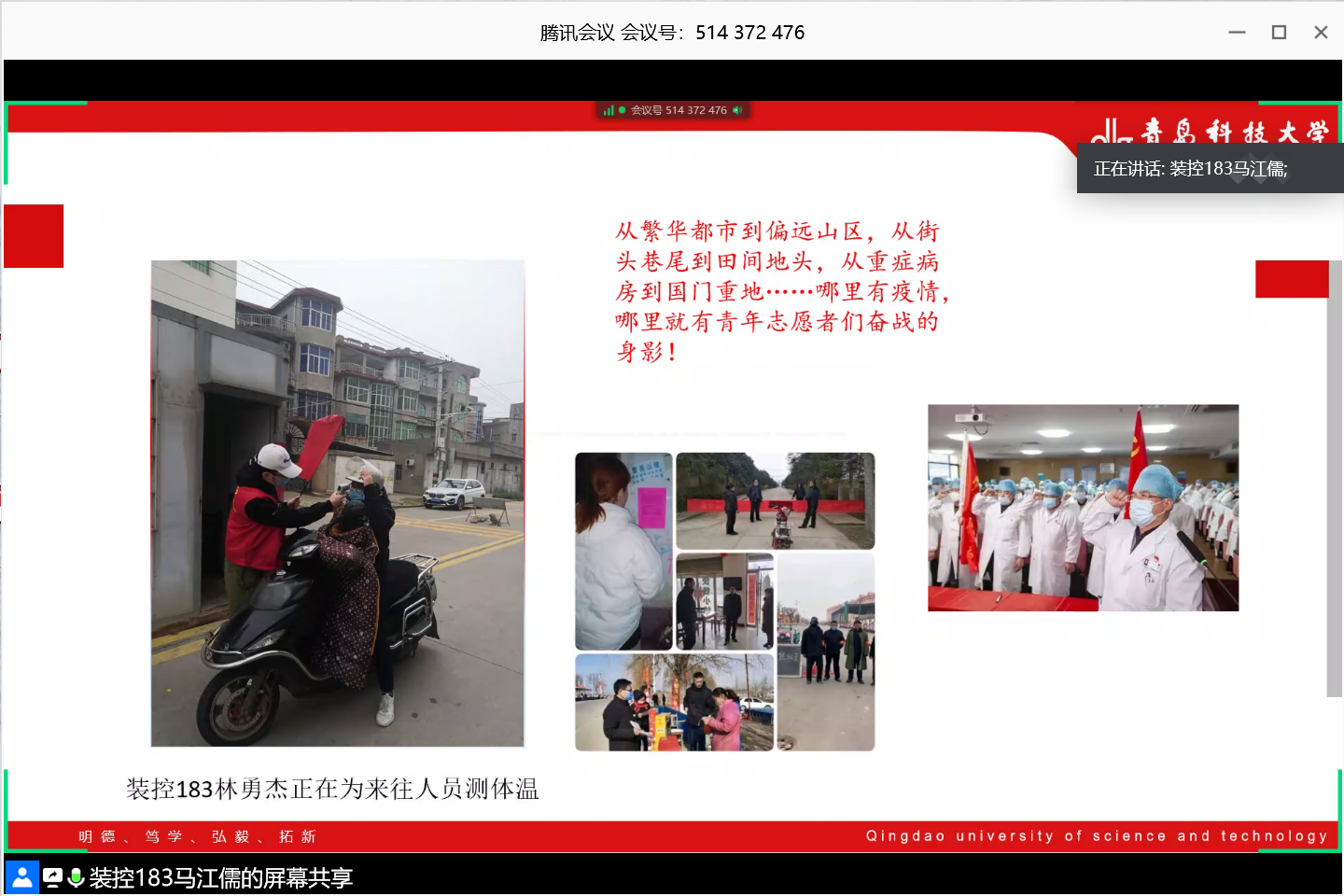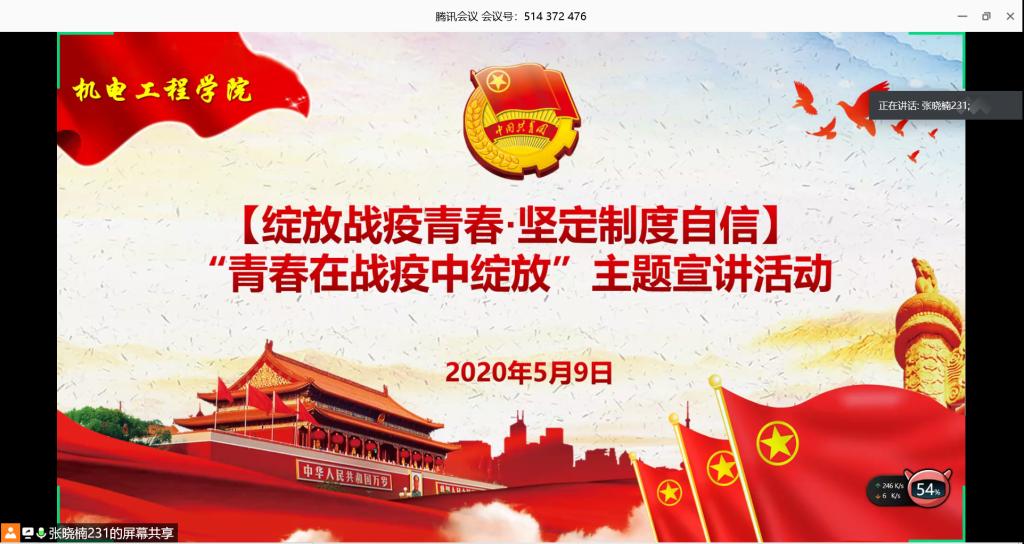 为深入贯彻落实习近平新时代中国特色社会主义思想对青年行动的指导,5月9日,在纪念五四运动101周年、新冠疫情防控阻击战取得重大战略成果之际,太阳成tyc7111cc分团委组织部举办“青春在战疫中绽放”线上主题宣讲活动。分团委组织部部长王娟娟老师出席了活动,罗浩宇、刘龙、马江儒和马元宇四位团员作为机电团员青年战疫典型代表宣讲了他们勇战疫情的青春故事,17级、18级、19级200余名团学骨干通过“腾讯会议”参与了活动。活动由分团委组织部副部长张晓楠主持。