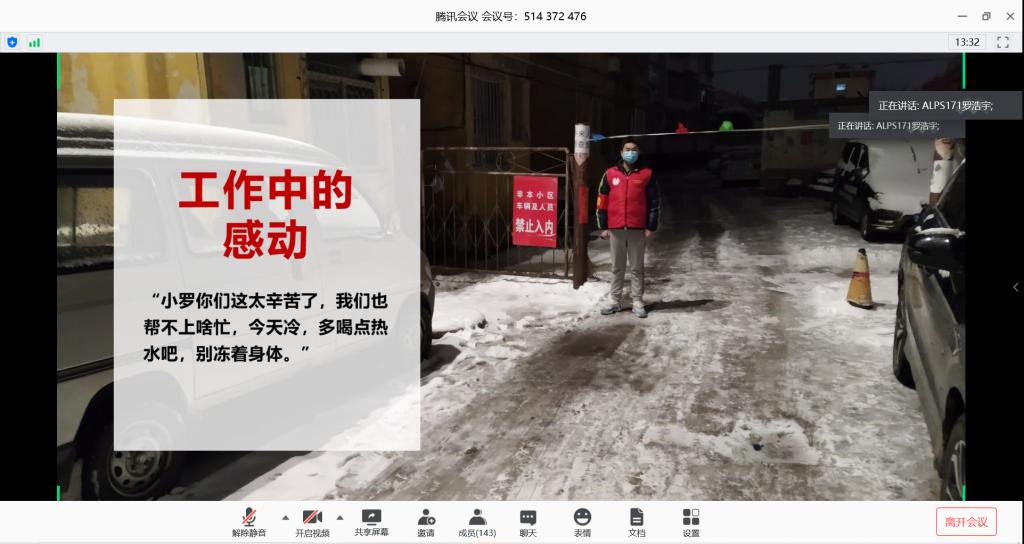 罗浩宇从一名员工党员和员工骨干的角度讲述了自己参与疫情志愿工作的所感所想。疫情暴发正值新年期间使得防疫工作更加紧张复杂,而他在社区居民的积极配合和温暖关怀下勇往直前,利用奖学金为工作人员和环卫工人送去温暖;作为太阳成tyc7111cc员工会主席,发挥模范带头作用,举办“共抗疫情,爱国力行”系列活动及“四个一”系列活动,引导同学们学习习近平总书记的重要指示精神,鼓励大家勇于承担青年人的社会责任。
