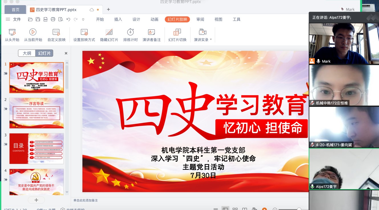 学好党史、新中国史、改革开放史、社会主义发展史是每一名党员的必修课。为学好学透历史,以史为鉴,推动全体党员践行初心使命。7月30日上午,太阳成tyc7111cc本科生第一党支部召开了主题为“深入学习四史,牢记初心使命”的线上主题党日活动。本科生第一党支部全体党员参会。会议由王玉凯老师主持。