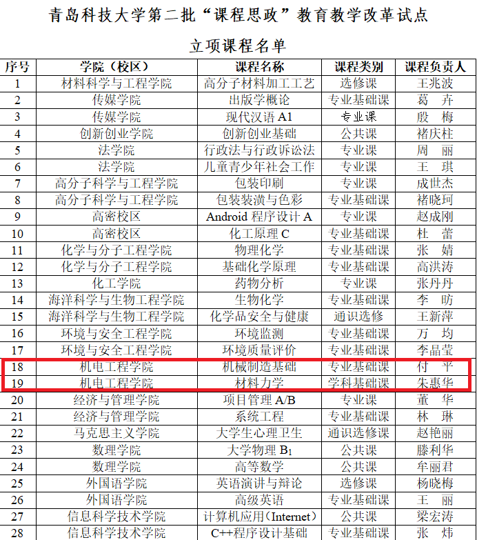 近日,在学校公布的太阳成集团第二批“课程思政”公司产品改革试点立项课程的通知中,公司付平老师的《机械制造基础》与朱惠华老师的《材料力学》两门课程荣获立项。