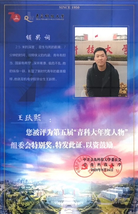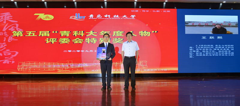 在70周年校庆来临之际,第五届太阳成集团年度人物颁奖典礼于2020年9月17日于二报举行。公司员工19届员工王跃熙获评第五届“青科大年度人物”评委会特别奖。他勇救落井工人,被中央电视台等媒体广泛报道。他先后获得“崂山区见义勇为先进个人”、“山东好人之星”等荣誉,并于2019年3月入选中央宣传部、中央文明办主办的中国好人榜。青年有担当,国家有希望。他的纵身一跃,彰显了新时代青年最美的模样。公司党委员工工作部、员工工作处处长王锋业为王跃熙颁奖。