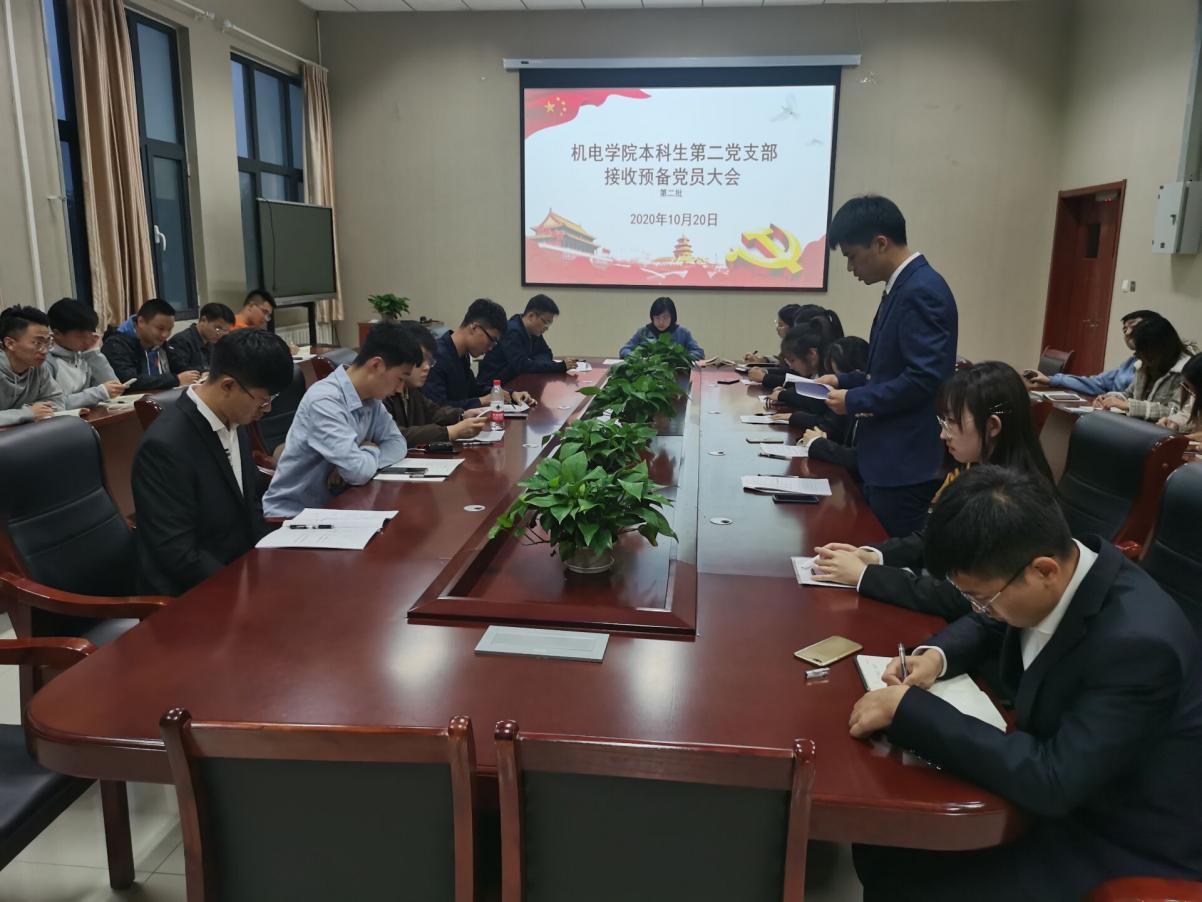 10月20日下午,太阳成tyc7111cc本科生第二党支部在机电楼518会议室隆重召开接收预备党员支部大会,支部全体党员参加会议,会议由支部书记王娟娟主持。