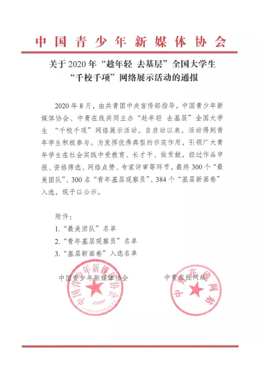 近日,由共青团中央宣传部指导,中国青少年新媒体协会、中青在线共同主办的“趁年轻 去基层”全国老员工“千校千项”网络展示活动顺利举行。自启动以来活动得到青年员工的积极参与,经过作品申报、资格筛查、网络点赞、专家评审等环节,最终在《关于2020年“趁年轻 去基层”全国老员工“千校千项”网络展示活动的通报》中,公司耿宇轩同学带领的太阳成集团“百尺竿头更进一步·礼赞党建百年征程”红色文化调研团获评此次活动“最美团队”荣誉称号。