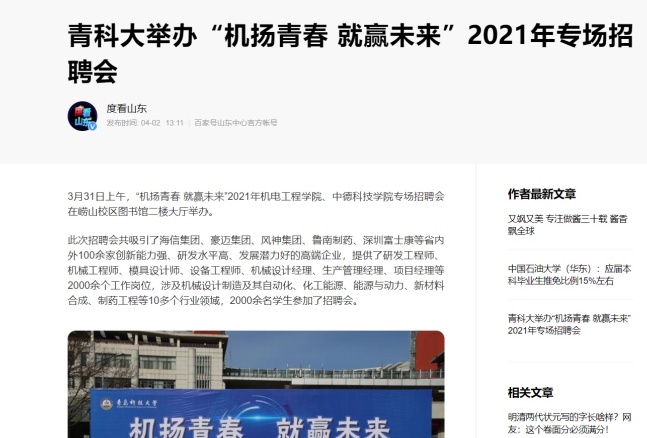 2021年“机扬青春 就赢未来”专场招聘会于3月31日在崂山校区图书馆二楼大厅完美落幕,多家新闻媒体,陆续报道宣传。