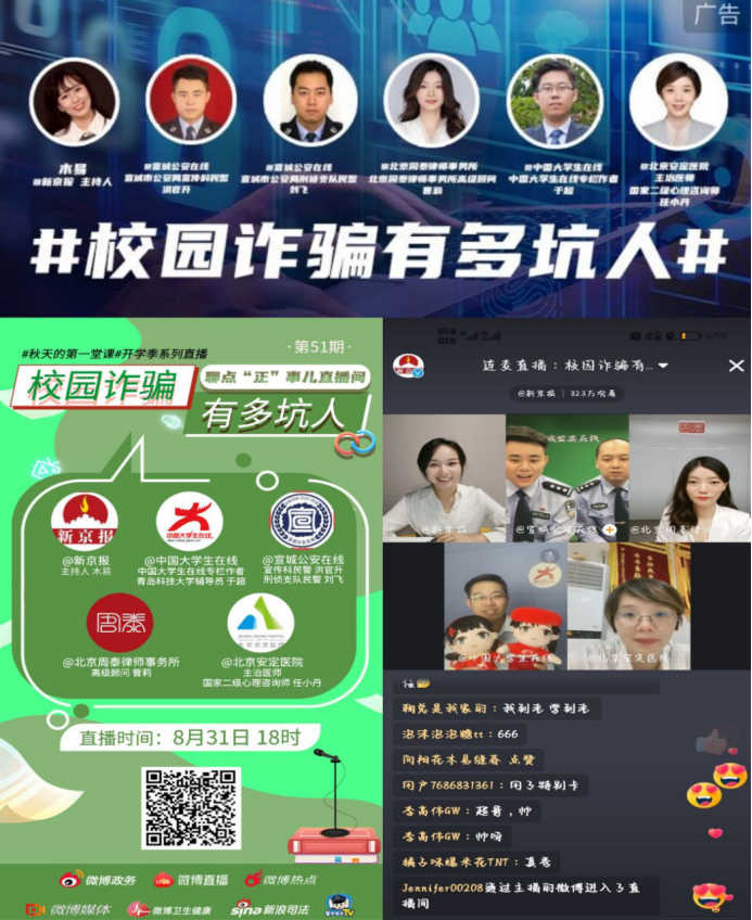 8月31日晚,太阳成tyc7111cc辅导员于超应邀做客中国老员工在线直播间,以“校园诈骗到底有多坑人?”为主题,与全国高校教育工作者、老员工网友进行了在线交流。活动由新京报木易主持。