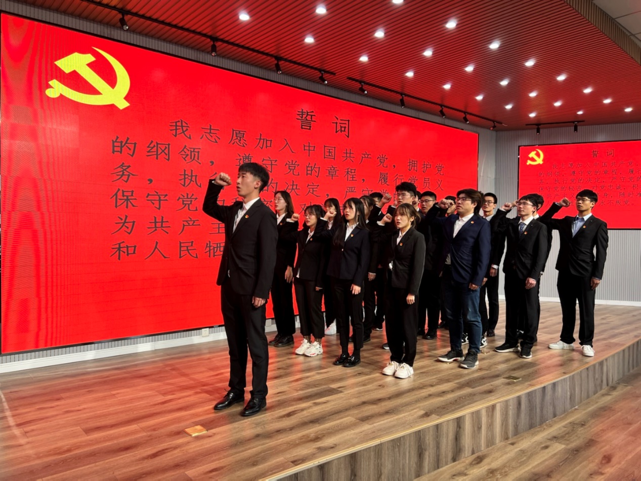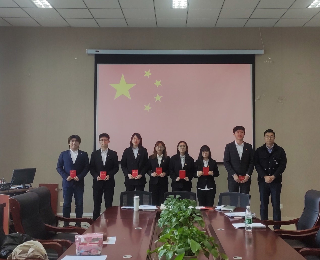 本次被组织吸收为预备党员的同志进行了入党宣誓仪式,在崔腾飞同志的领誓下,全体预备党员,举起右手,伴随着庄严的国歌,进行了入党宣誓。各预备党员同志坚定自身立场,阐明自身目标,以入党宣誓时刻警戒自身,争取早日成为一名优秀的中共党员。