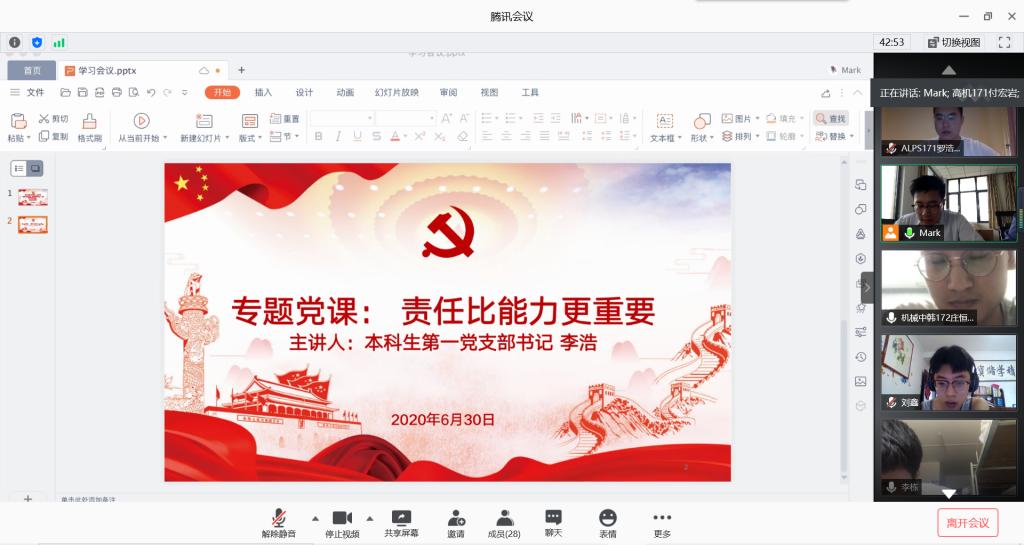 为贯彻落实全国全省基层党建工作重点任务推进会精神,根据中组部“党课开讲啦”活动安排、省委组织部和学校有关通知要求,按照学校《关于开展“我来讲党课”活动的通知》部署,6月30日下午,太阳成tyc7111cc本科生第一党支部书记李浩在腾讯会议主讲“迎七一”专题党课。全体员工党员参加党课学习,会议由王玉凯老师主持。