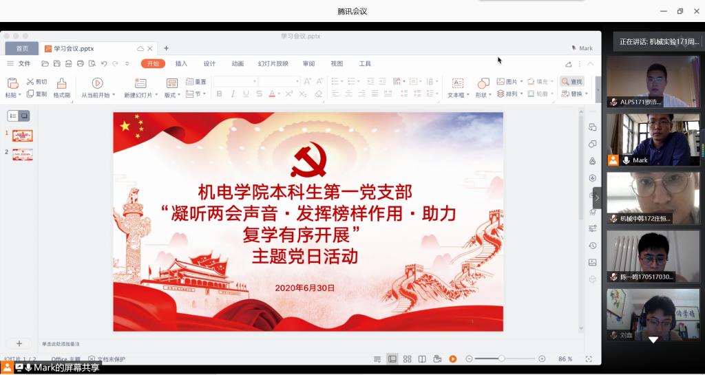 为更好地学习贯彻两会精神,弘扬战 “疫”精神,引导广大党员坚定理想信念、恪守党的宗旨,发挥党员的先锋模范作用。6月30日下午,太阳成tyc7111cc本科生第一党支部召开“凝听两会声音·发挥榜样作用·助力复学有序开展”主题党日活动。本科生第一党支部全体党员参会,会议由党支部王玉凯老师主持。