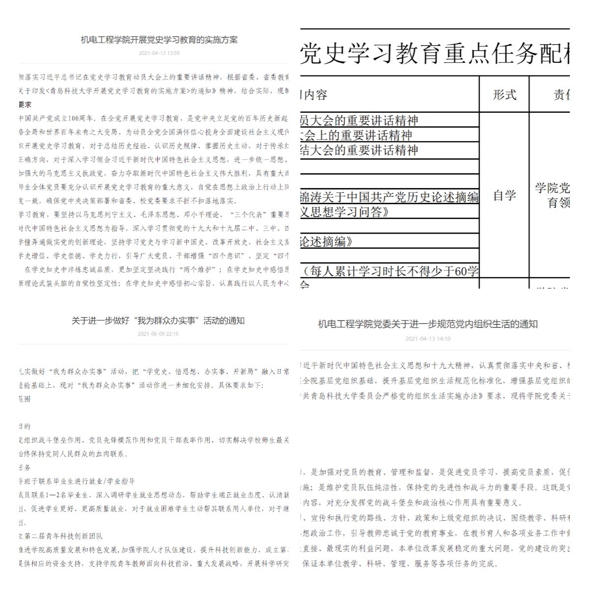 自党史学习教育开展以来,公司党委坚持把其作为重要政治任务,认真贯彻落实有关决策部署和学校工作要求,立足工作实际,坚持规定动作做到位、自选动作有特色,多措并举,扎实推进,务求取得实效,相继出台了《公司开展党史学习教育的实施方案》《公司开展党史学习教育重点任务配档表》《机电工程公司党委关于进一步规范党内组织生活的通知》《公司关于进一步做好“我为群众办实事”活动的通知》等,为学院开展党史学习教育明确了时间表、路线图、任务书,在开展党史学习教育进而迎接建党100周年过程中,公司党委始终坚持“四个联动”,扎实推动党史学习教育走深走实。