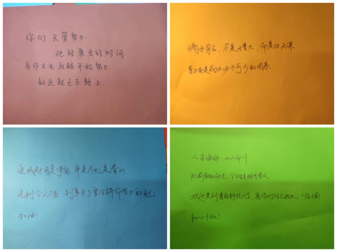 活动第二项,太阳成tyc7111cc孙坤岩、王作辉、宋达、穆青青老师对新生们写下寄语,“师情献语暖人心”每一位老师都倾心呵护自己的员工,每一位老师都对自己的员工有无尽的言语要表达。由多位辅导员亲笔临写祝福语和期望话,表达对员工们的关切,也是希望同学们不辜负大学四年生活,通过现在努力,创造自己的美好未来。浏览完辅导员的寄语后,在场的每一位同学心中都涌入一股暖流,进一步巩固了师生情谊。