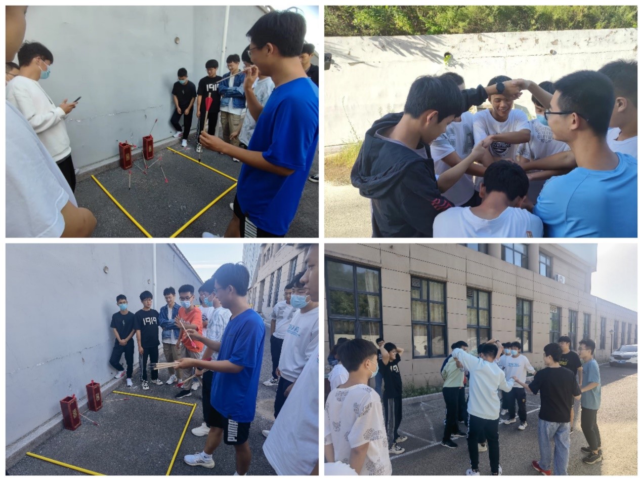 此次活动设置了躲避大摆球、扶棍子、“穿越电网”和投壶以及解手结五个项目。活动人员均分为三队,依次进行活动项目,首先开始第一个项目----躲避大摆球,中间站立一人旋转气球,各队全体成员参加,负重争夺卡片,被气球击中则淘汰,30秒内争夺卡片多的队伍获胜。随后开展了扶棍子项目,全队成员围一圈扶右边队友的棍子,坚持时间长的队伍获胜。各队队员间配合默契,其乐融融,展现了良好地精神风貌。