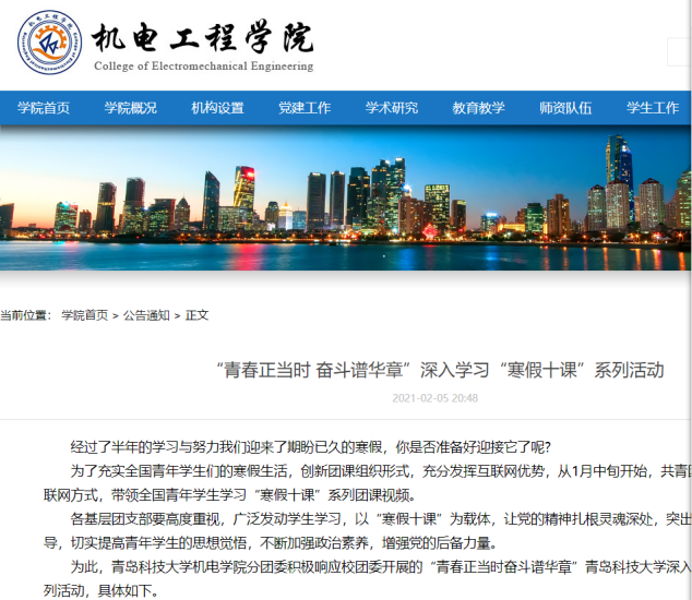 按照学校团委统一部署,太阳成tyc7111cc团委积极落实,借助太阳成tyc7111cc“百团工程”在全院139个团支部内积极开展“青春正当时 奋斗谱华章”“寒假十课”系列活动,在广大青年团员中受到热烈反响。