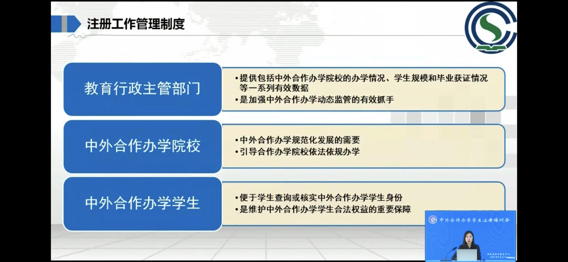 此次培训会邀请教育部国际司领导出席并讲话,邀请中外合作办学领域专家分享中外合作办学工作的实践经验和思考;培训会还介绍中外合作办学员工注册工作管理制度,讲解中外合作办学员工注册系统的新功能、相关工作标准和操作流程,达到增进交流、规范管理的目的。
